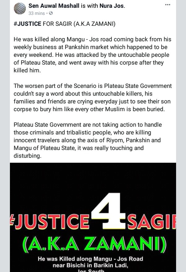 "He was killed along Mangu - Jos road coming back from his weekly business at Pankshin market which happened to be every weekend. He was attacked by the untouchable people of Plateau State, and went away with his corpse after they killed him." Senator Auwal Mashall wrote on Facebook today.